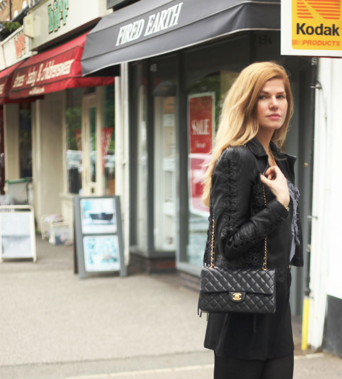 I decided to go for dark colours as the weather was not that welcoming. And as usual wearing my Chanel bag and you know my passion for leather jackets. Veronika was wearing Zara jacket, pants from Reiss, Marc Jacobs sunglasses and Celine bag. I only wish she would ever allow me to take picture of her face. I thought models love to pose :DDD