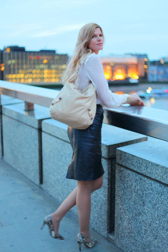 Wearing: River Island leather Skirt, Balenciaga Bag, Zara Blazer, BCBGeneration shoes, Oasis Blouse, H&M necklace