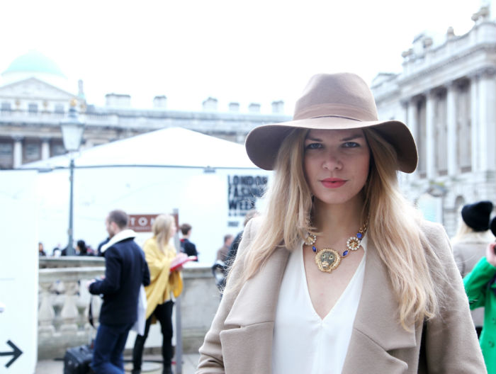 Londynsky tyden mody je tady a pocasi pralo vsem milovnikum mody, protoze bylo kolem deseti stupnu a dokonce i sem tam svitilo slunicko. Ja jsem sla dneska do kuze a neutralnich barev, aby mi hezky vynikl tento vyrazny nahrdelnik s hlavou lva. Stravila jsem prijemny den v Sommerset Housu a take jsem si uzila nataceni promo videa s firmou Scavi & Ray, kteri si me vybrali jako modelku. Alespon jsem mela vymluvu, ze piju bublinky behem dne (nerada bych byla oznacena za alkoholika).