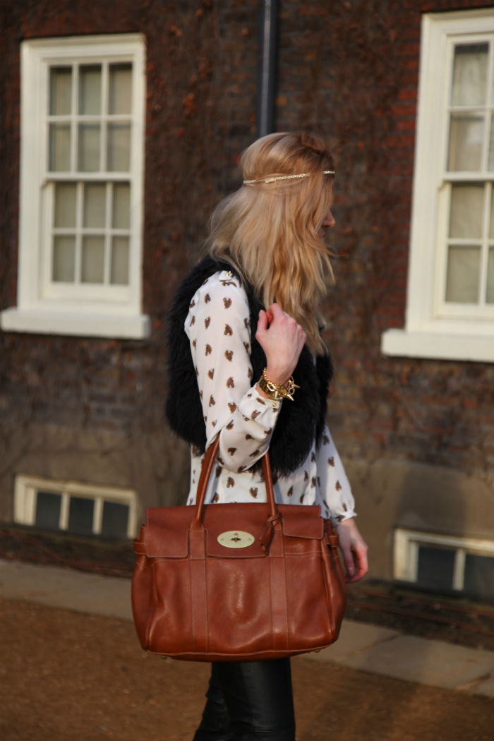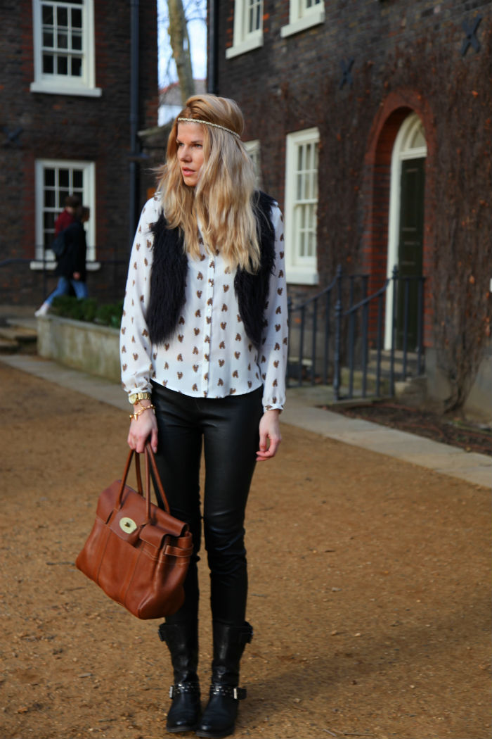 Wearing: Zara shirt and Leather pants and headband, Warehouse boots, Mulberry bag, New Yorker faux fur vest