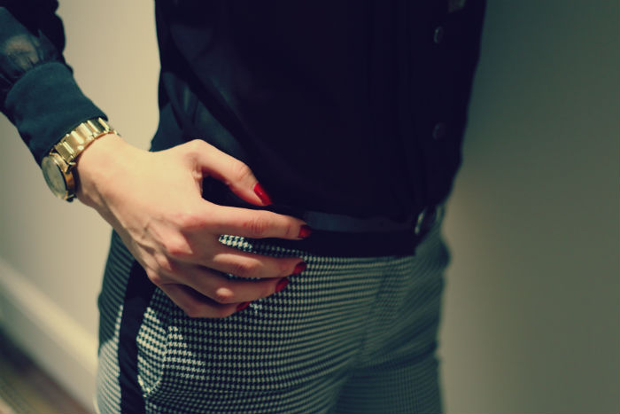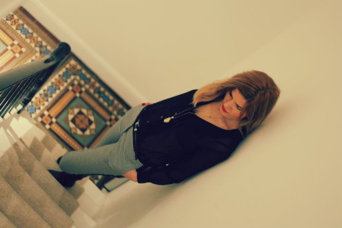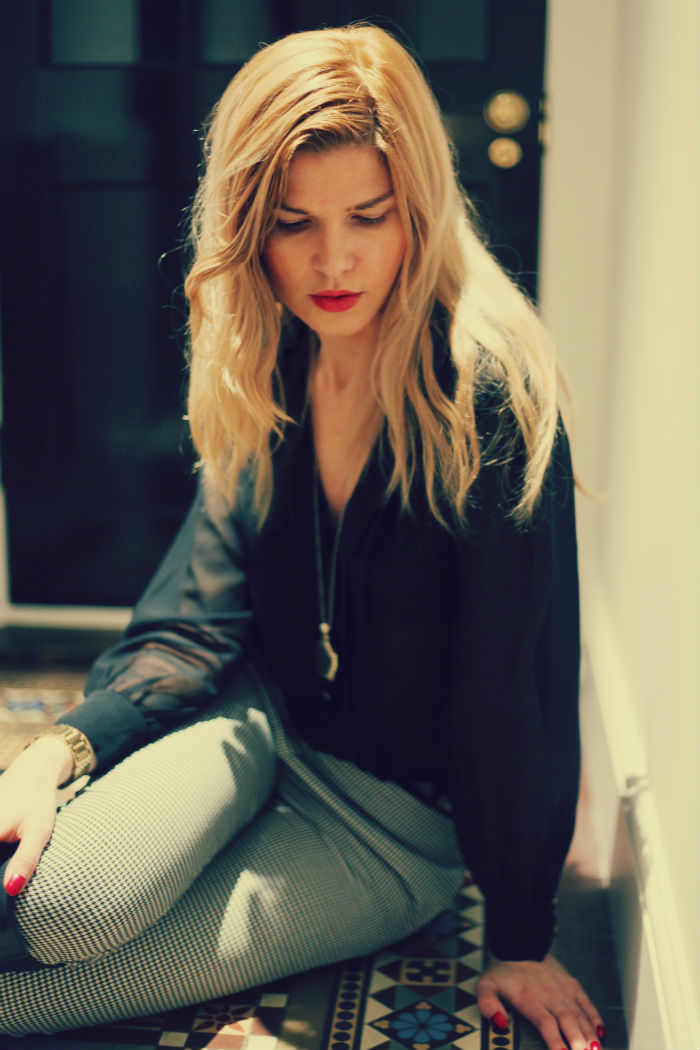 I don’t know how about but I have always been a fan of black and white combined with red lipstick and red nail varnish. I went to see a friend of mine after work today and this was easy outfit. It is a classic dog tooth print on the trousers and teamed with see through black blouse. Very simple but it can look chic.