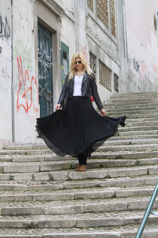 One early morning it looked like the weather was not going to be the best so I needed to dress for both versions. I picked the long pleated skirt and pair of black tights (which you can always take off and put in your bag) and simple vest with leather jacket (that you can easily put in a bag if it gets too hot). Well anyway it was clever to dress like this as the tight and the jacket ended up in my bag later.